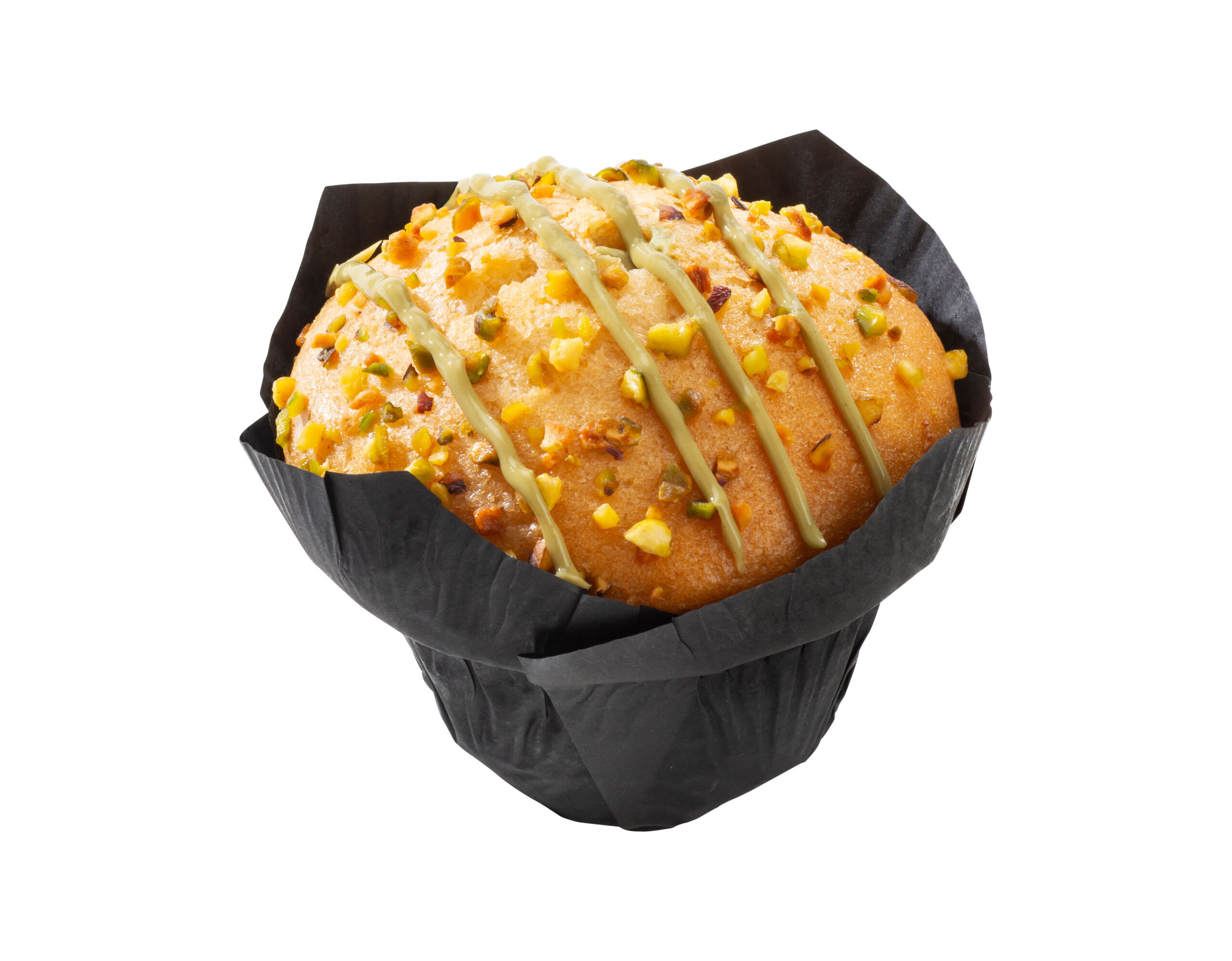 Muffin gevuld met pistachecrème en afgemaakt met pistachenootjes en een pistachecrème decoratie.